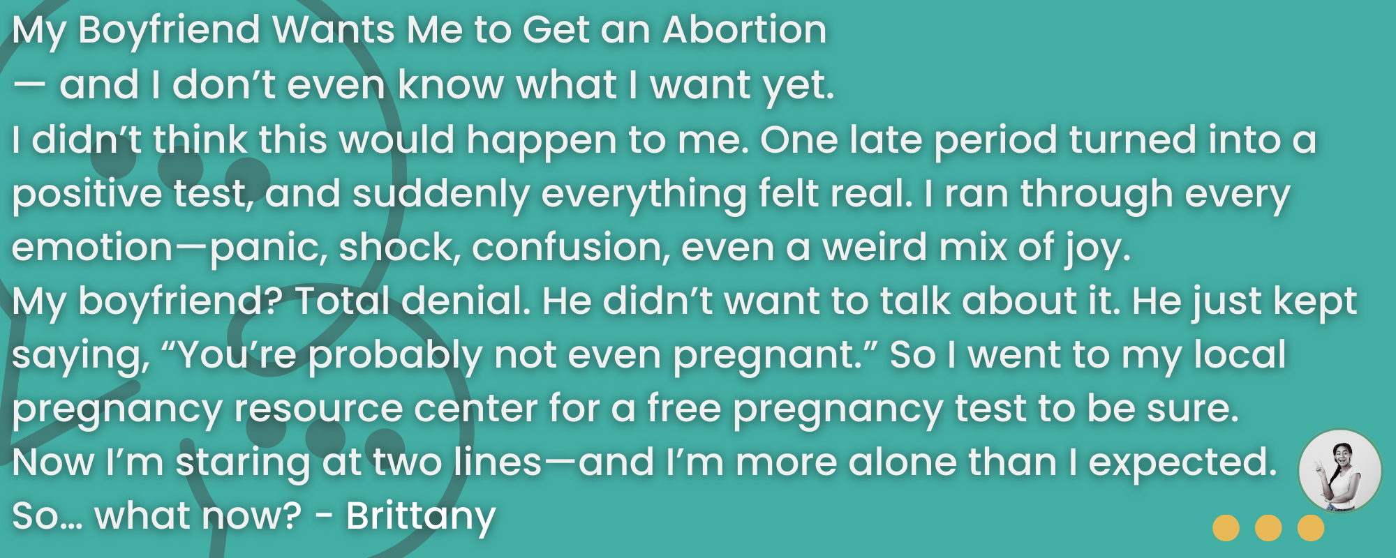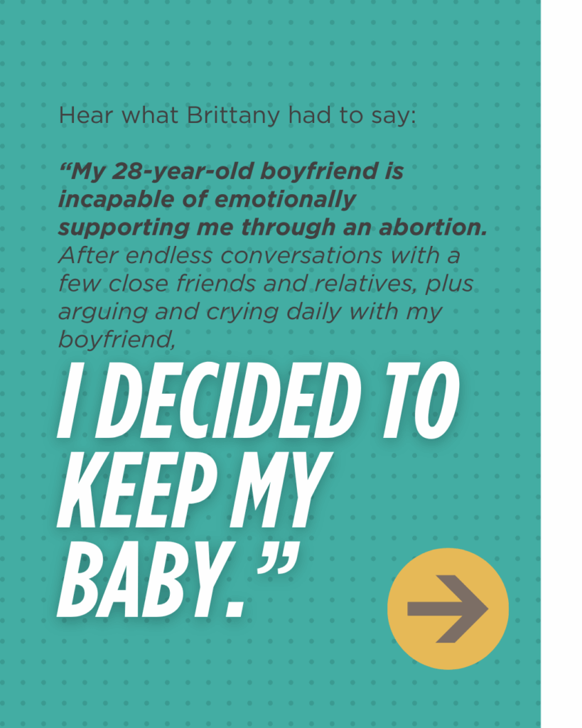 You can do this. This is not the first time pregnant women have decided to keep their unborn children. Maybe you’re thinking “Brittany had it easy. The fact that my boyfriend wants an abortion is not my only problem.” Client advocates have worked with hundreds of women with all sorts of problems. Get in touch to learn how we can help in your unique situation.