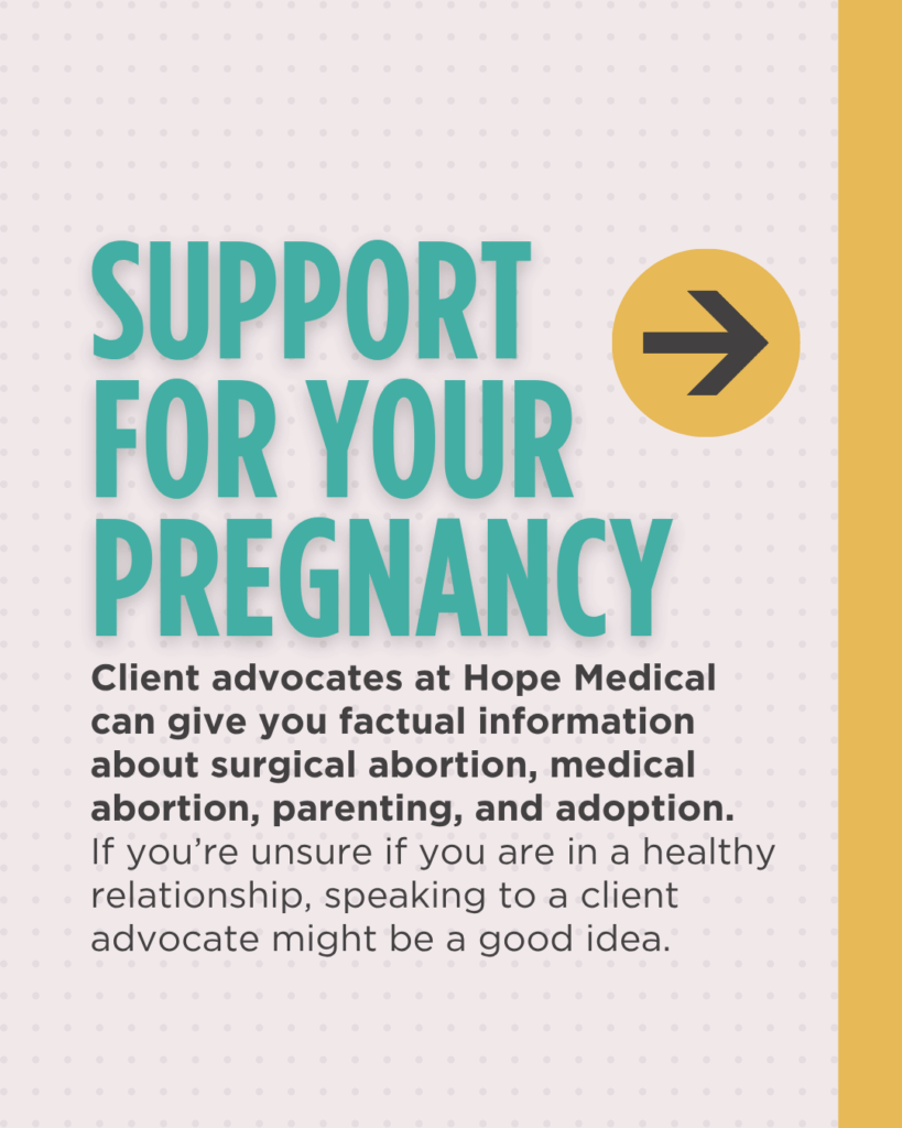 Speaking of support, did you know your local pregnancy resource center can talk you through your pregnancy options? Know your legal rights – no one can force you to abort. In order to make the best decision, you need to know your available options. Client advocates at Hope Medical can give you factual information about surgical abortion, medical abortion, parenting, and adoption.