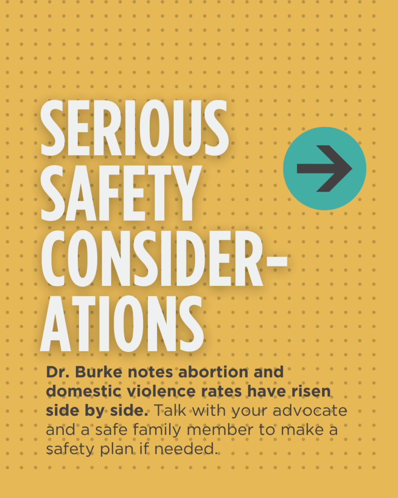 Did you know there’s an association between abortion and domestic abuse? It’s not always the case, but sometimes an abusive relationship leads to unplanned pregnancy and then abortion. Put another way, women with a history of Intimate Partner Violence had significantly higher odds of unintended pregnancy and abortion (2). According to Dr. Burke, “the abortion rate and the domestic violence rate have risen almost side by side. Abortion, for both women and men, is associated with self-hatred, self-punishing behavior, and an increased tendency to act out anger and rage toward others.” (3). Work with your client advocate, and tell a safe family member if you need to make a safety plan.