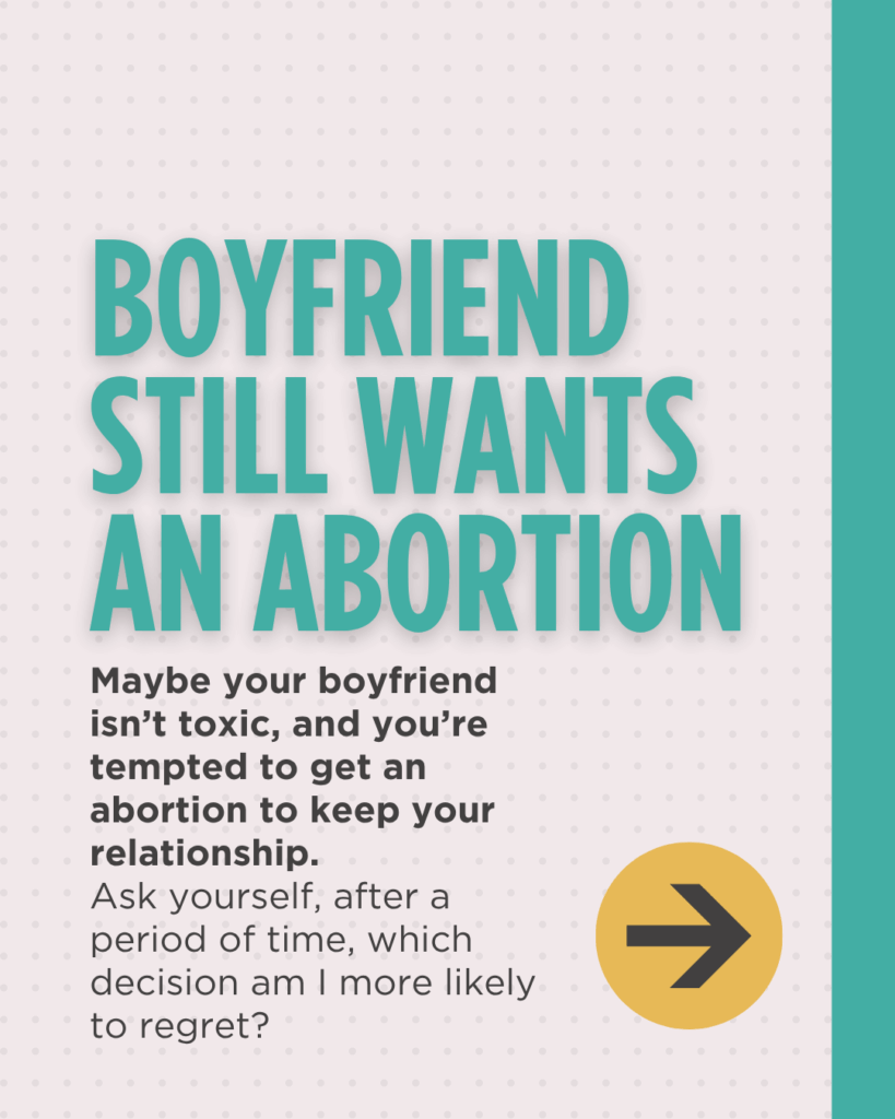 Maybe your boyfriend isn’t toxic, and you’re still tempted to get an abortion to keep your relationship. Sometimes it’s helpful to map out all the possibilities. You could: